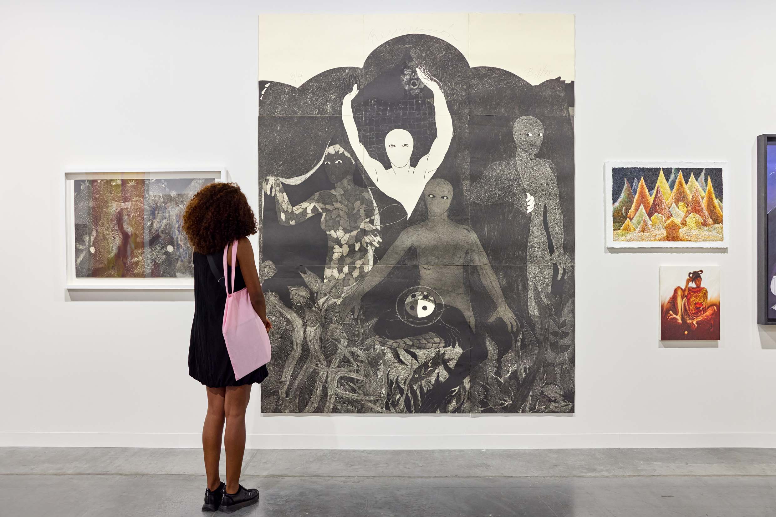 Luisa Rabbia’s The Network (Peter Blum Gallery) illustrated this insistence on engagement. Her interlacing marks trace tension and connection, dense in some areas, sparse in others, forcing the eye to navigate and to consider the relationships between figure and void; the voids within the piece an the void between the spectator and the spectated. Kennedy Yanko’s Intimacy of Throes (Library Street Collective) transformed industrial scrap into forms that feel simultaneously heavy and liminal, with surfaces that seem to fold light and shadow. The late Cuban printmaker Belkis Ayón (David Castillo Gallery) used collagraph to balance silhouettes and negative space with remarkable economy, producing work that is immediate, baring the raw mechanics of a dream.